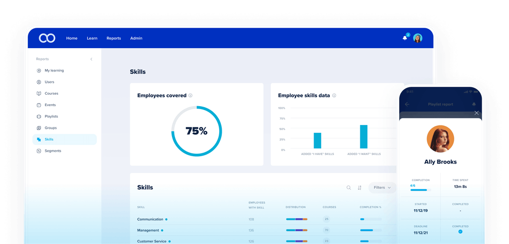With eloomi Skills you can reveal the skill gaps in your organization, plan data-driven training strategies, and receive intelligent content recommendations to pair needed skills with relevant courses to nurture your talent pool.