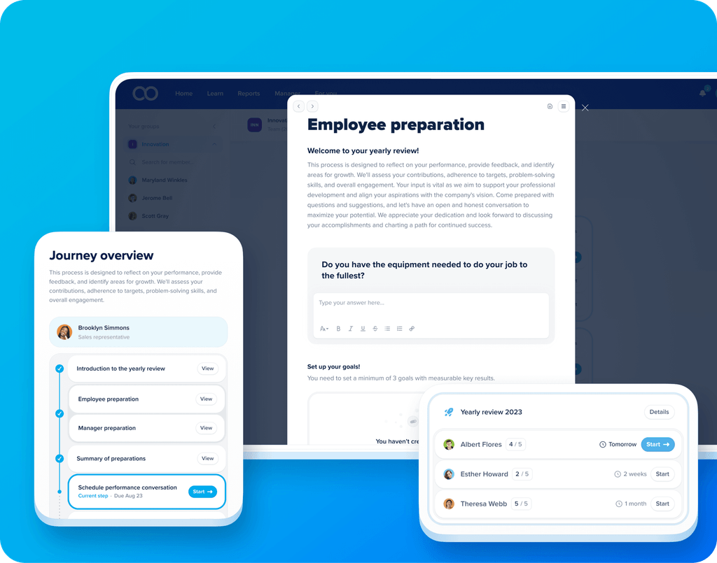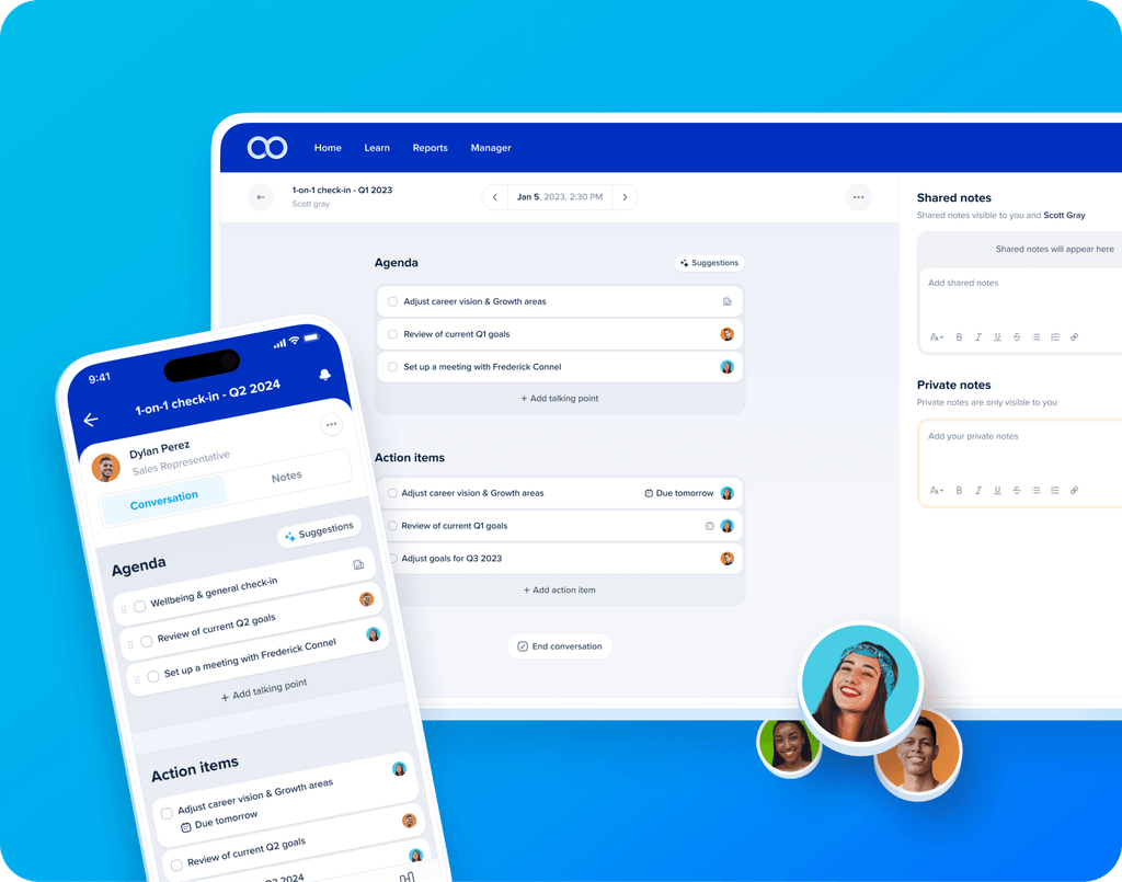 Empower meaningful growth & development with performance management software. Bring structure and purpose to your one-to-ones, set actionable goals for individual and business success, and ensure consistency with automated scheduling and reminders. Say goodbye to manual and time-intensive processes, and hello to a performance routine that drives results.