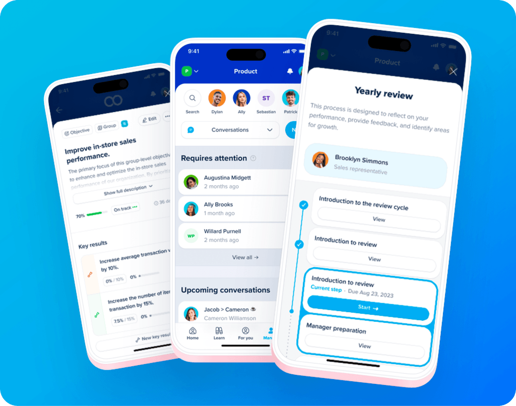 Empower your managers to have better growth conversations. Set goals, track performance, enable 1-1s and capture feedback. Plus, find time-saving opportunities with automated HR workflows.