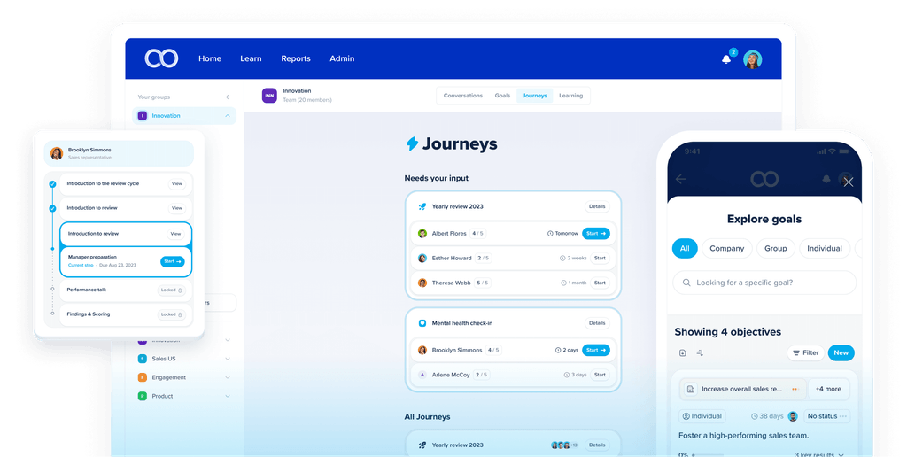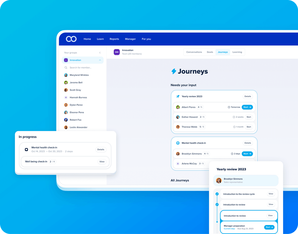 - Easily manage custom workflows by role or department, with specialized journeys for leadership tracks or talent development